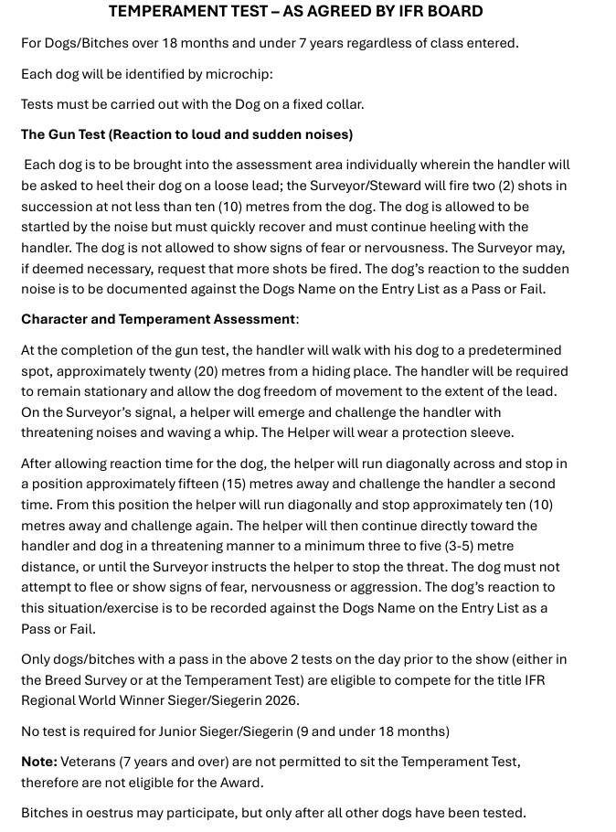 TEMPERAMENT TEST FOR DOGS BITCHES 18 MONTHS AND OVER WISHING TO COMPETE FOR IFR REGIONAL WINNERS. PLEASE CHECK ATTACHED RULES.